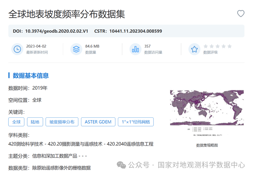 由昆明理工大学的唐铃、马经纬、邵志燚、彭秋志等老师提交的全球地表坡度频率分布数据集,经审核整理后正式在国家对地观测科学数据中心发布,热忱欢迎广大科研工作者关注并获取数据。