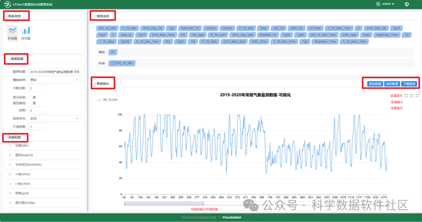 可视化页面功能丰富,你可以自由配置,实现想要的可视化效果。左侧支持折线图和柱状图两种图标类型,支持对图表的标题、横轴排序、小数位数、线宽、不透明度等进行配置,还支持对标题、图例、字体样式、x轴、y轴、网格和提示框的高级配置。“维度选择”列举了可视化数据的所有Schema,你可以拖动选择列作为横轴和纵轴。选择横轴和纵轴后,“图表展示”处可展示数据,下方的滚轮可以拖动显示不同的区域,右侧的“区域放大”、“区域缩小”和“全屏显示”也支持对显示区域进行控制。支持查看“原始数据”,“保存配置”,如果你得到了一张不错的可视化图表,可以点击“下载图表”将图表保存。