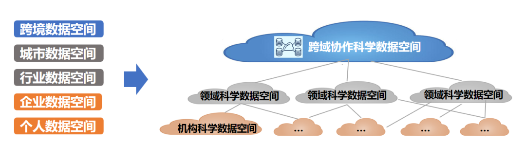 行动计划提出,可信数据空间包含企业、行业、城市、个人、跨境五大类别。与之类似,开放科学数据空间具有不同的类型,包含机构科学数据空间、领域科学数据空间,以及跨域协作科学数据空间等,这些数据空间彼此交互,将呈现出复杂的网络结构。