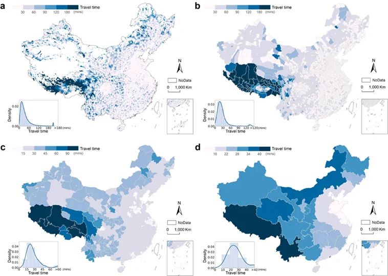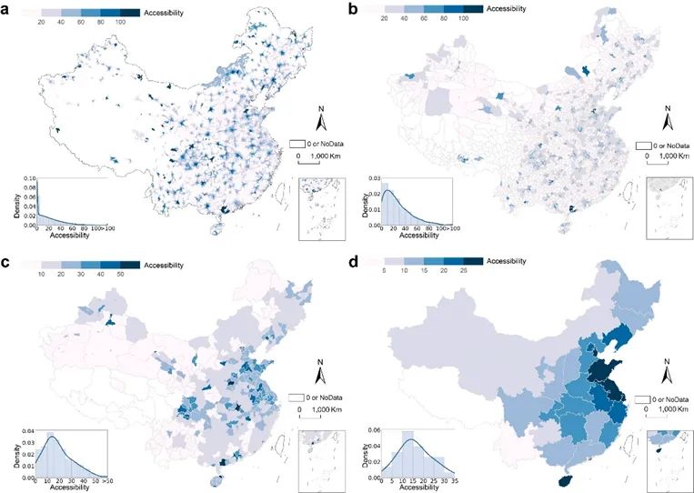 图3 多尺度医院可达性数据集 (a) grid; (b) county; (c) city; (d) province.