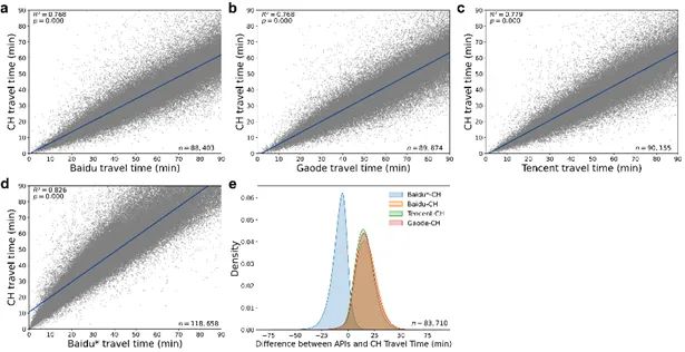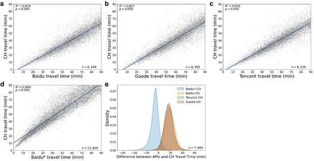 为验证模型估计结果的准确性,引入百度地图API(分别提供实况估计与理想估计)、高德地图API和腾讯地图API作为外部数据源进行验证,结果如图4、图5所示。结果显示,当设定时间阈值参数为90分钟时,省域尺度下模型出行时间估计与各API的估计值之间存在显著的正相关关系(R²=0.82-0.87,p<10⁻⁴),市域尺度下R²=0.77-0.83(p<10⁻⁴);当解除时间阈值限制时,省域尺度R²=0.96-0.97(p<10⁻⁴),市域尺度R²=0.88-0.90(p<10⁻⁴)。
