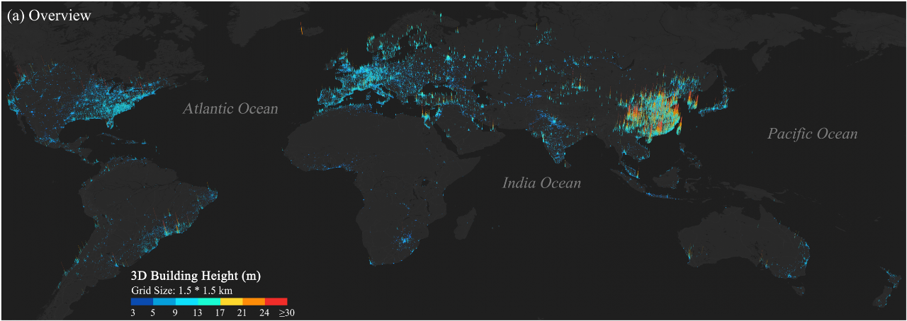 [1] Ma, X., Zheng, G.*, Xu, C.* et al. A global product of 150-m urban building height based on spaceborne lidar. Sci Data 11, 1387 (2024). https://doi.org/10.1038/s41597-024-04237-5