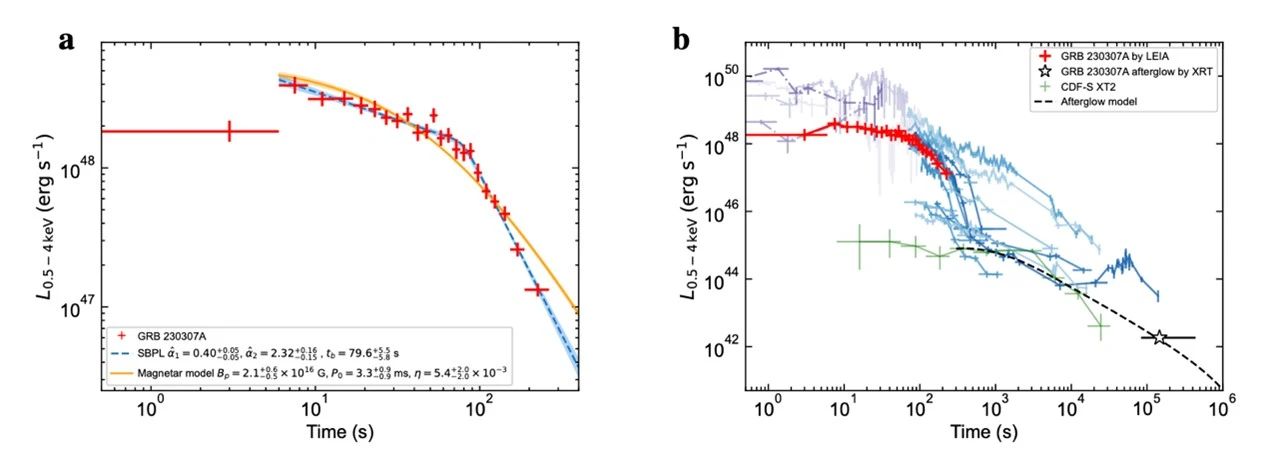图1:GRB 230307A的X射线光变曲线以及磁陀星作为中心引擎的模型拟合