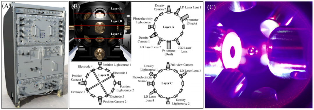 图1 中国空间站无容器材料科学实验架上的静电悬浮炉(A),带有36个光学窗口的实验室(B)和全视图相机的快照 (C)