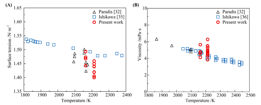 图3 Zr熔体表面张力的温度依赖性(A),Zr熔体粘度的温度依赖性(B)