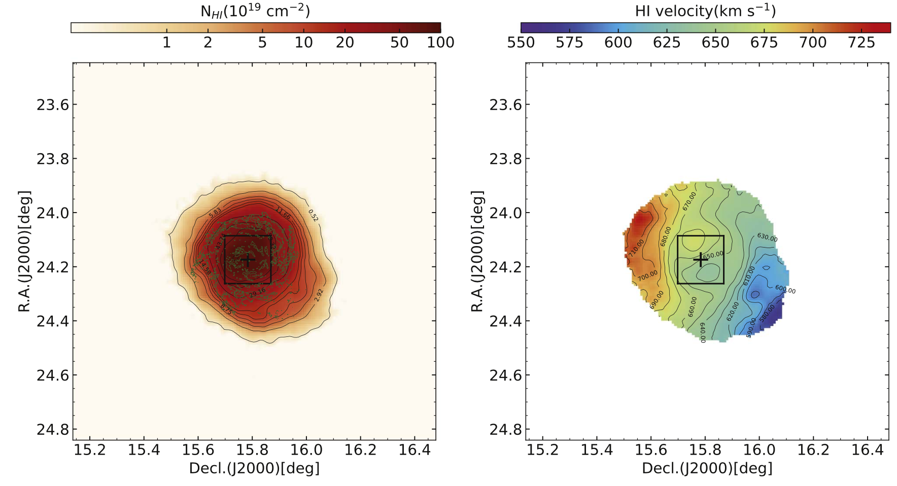 图1 FAST观测NGC 628的中性氢气体分布(左图)和气体动力学分布图(右图)