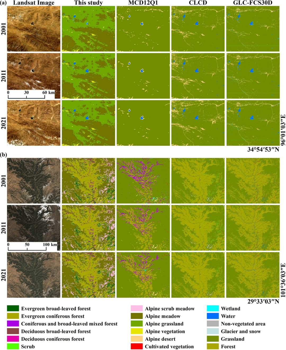 图4:本数据集与MCD12Q1、CLCD和GLC-FCS30D的比较. (a)高寒草甸和高寒草原为主的区域,(b)常绿针叶林和高寒草甸为主的区域