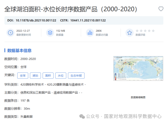 由中国科学院南京地理与湖泊研究所的宋春桥、陈探、詹鹏飞、罗双晓等老师提交的全球湖泊面积-水位长时序数据产品(2000-2020),经审核整理后正式在国家对地观测科学数据中心发布,热忱欢迎广大科研工作者关注并获取数据。