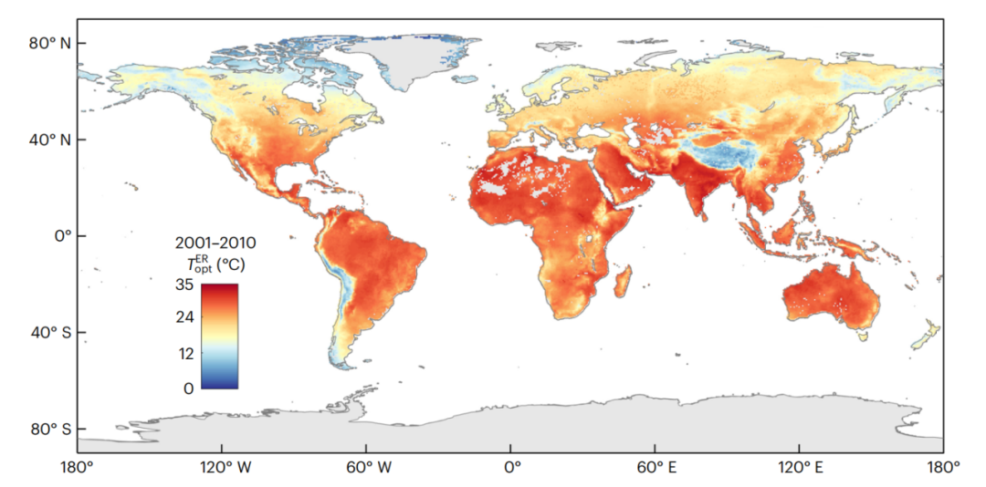2. 空间格局:当前气候下,ER的最适温呈现明显的纬度梯度,热带森林和干旱区的最高值接近30°C,而高纬度地区最低值约为10°C。