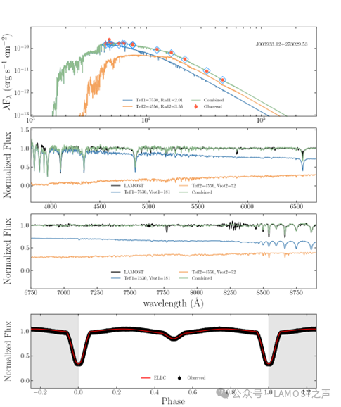图2:样本中的一个双星系统J0039的SED、光谱和光变曲线联合拟合结果。图片取自论文图集3。
