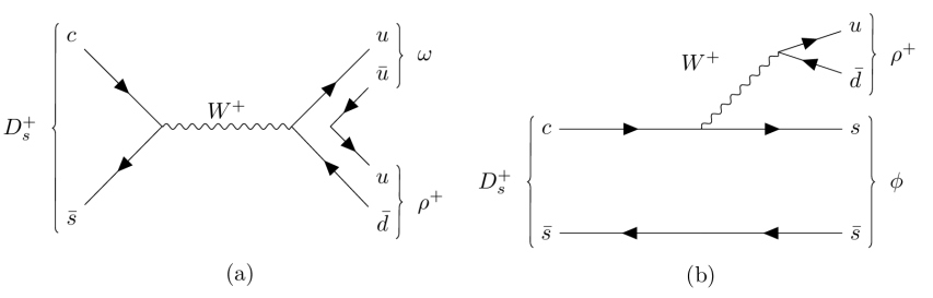 在粲介子衰变中,末态为两个矢量介子衰变被认为是寻找超出标准模型的新物理及研究强子结构的重要过程。理论认为此类衰变由横向极化主导,S波成分作为主要贡献存在。然而,现有实验表明,部分该类衰变过程由纵向极化主导,并观测到P波或D波主导的反常现象,这与传统理论预期产生了严重不符,并以“极化难题”为名在物理学家中受到广泛讨论。目前,物理学家常使用拓扑图方法研究该类过程,而纯W^-湮灭过程Ds^+→ωρ^+和纯W^-外发射过程Ds^+→Φρ^+是研究“极化难题”的重要研究对象。二者的拓扑图如图1所示。