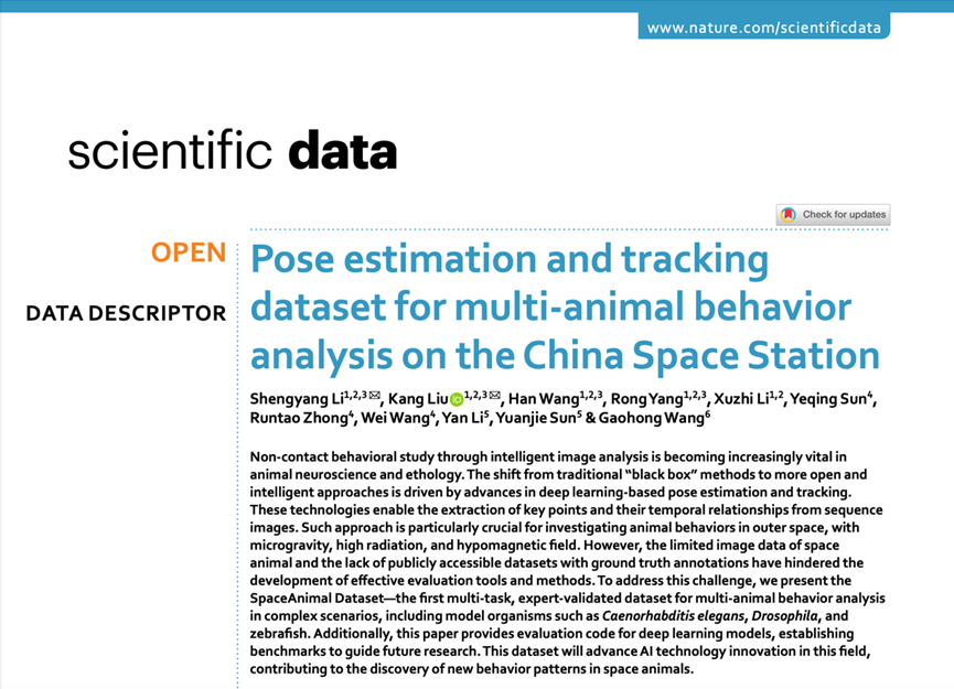 近期,国家基础学科公共科学数据中心“微重力多学科数据库”在Nature子刊《Scientific Data》发表了题为“Pose estimation and tracking dataset for multi-animal behavior analysis on the China Space Station”的研究论文,论文标志着全球首个空间多动物姿态估计与跟踪基准数据集——SpaceAnimal Dataset正式发布,为AI赋能太空生命研究提供关键数据支撑。本研究由中国科学院空间应用工程与技术中心牵头,联合大连海事大学、中国科学院生物物理研究所、中国科学院水生生物研究所等多家单位共同完成。论文受到国家基础科学公共科学数据中心项目(NO. NBSDC-DB-17)资助。