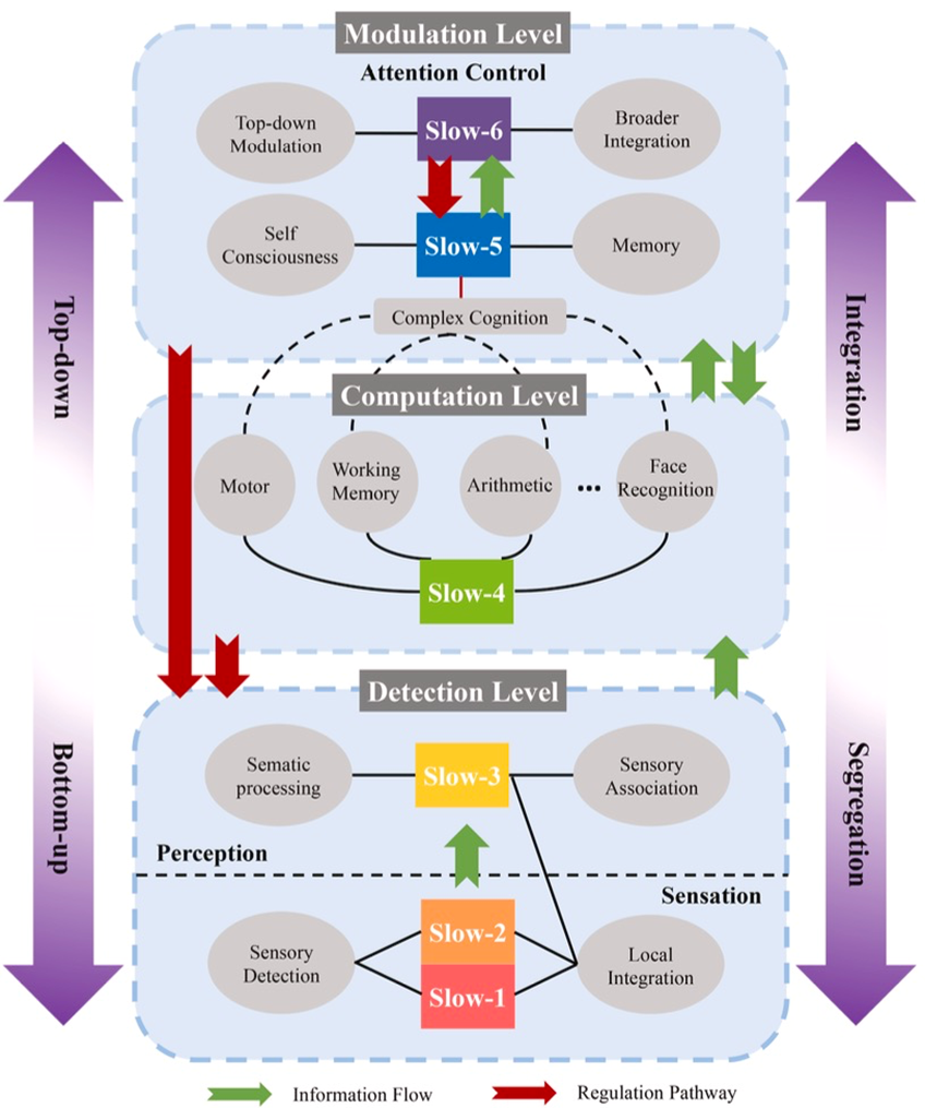 图4 三层级SSOs整合模型将SSOs的六个慢频段划分为三个交互式层级:探测层(slow-1/2/3)为自下而上的外部驱动,负责感觉与知觉。计算或表征层(slow-4)体现核心智能,具备多个功能模块。调控层(slow-5/6)整合来自高频的信息,并调节较快的SSOs