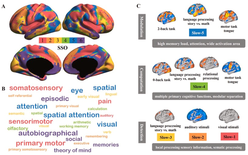 图5 自发和任务诱发脑活动的证据支持三级SSO整合模型:(A)第一个梯度最高值的频率排序图谱反映了特定脑区达到最高整合水平的频段;(B)对频率排序图谱进行元分析解码,字体颜色代表与功能术语相关的频段,字体大小表示相关系数的大小;(C)不同任务的多频段激活模式与三层级SSO整合模型吻合:探测层的激活仅限于感觉区域,尤其是感觉组分;计算或表征层表现为不同任务诱发的独特激活模式;调控层在高记忆负荷任务中具有更强的激活效应,注意网络则在各个任务中被广泛激活