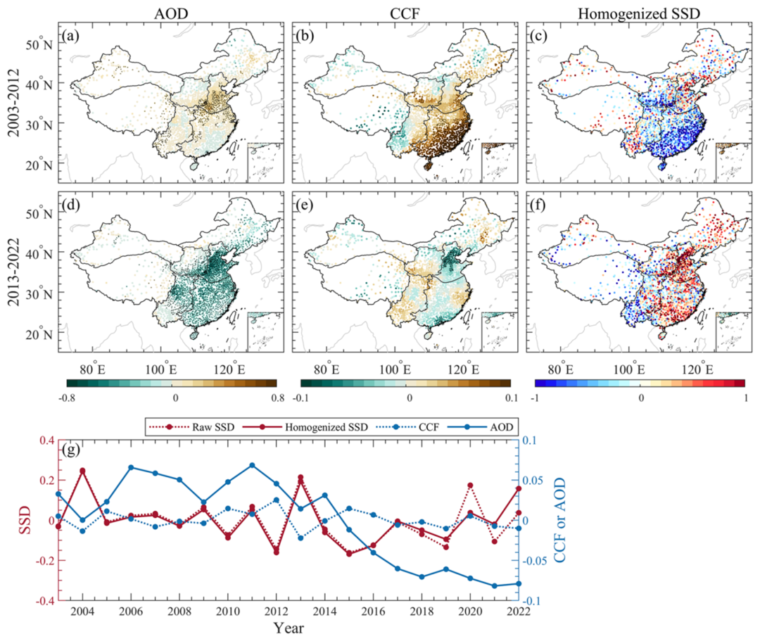 相比于原始SSD,均一化后的SSD与云覆盖分数(CCF)和气溶胶光学厚度(AOD)有着更强的相关性(图3)。具体地,2003-2022年CCF与SSD相关系数由-0.53提升至-0.71,AOD与SSD相关系数在华北地区由-0.40提升至-0.56。
