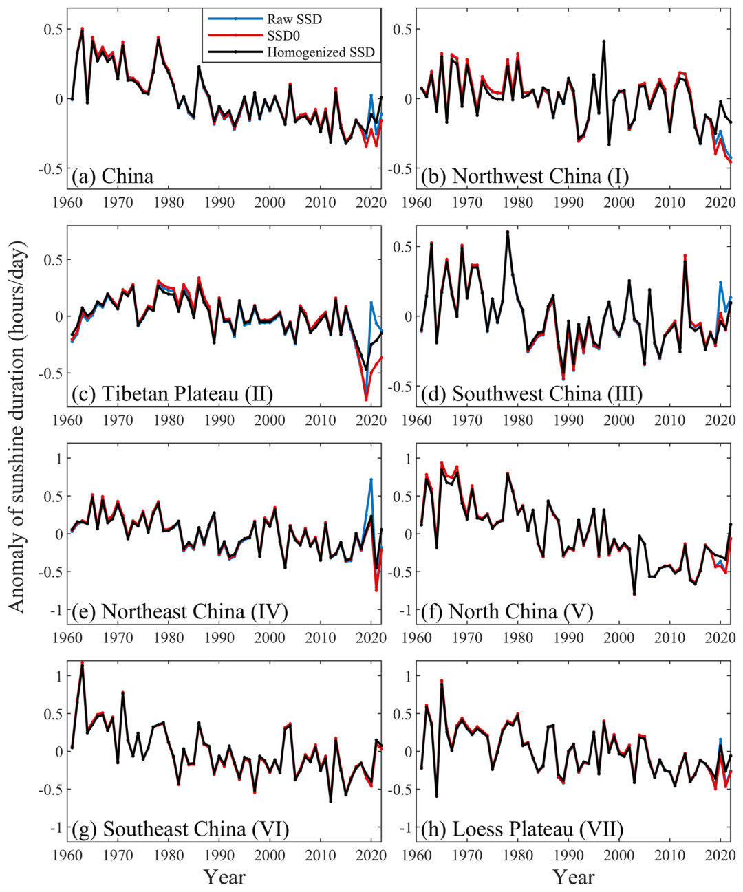 图2. 1961-2022年中国地区 (a) 及其七个子区域 (b-h) 原始SSD(蓝线)、day0型不连续性订正后的SSD0(红线)和最终均一化后SSD(黑线)的距平序列(参考时段为1961-1990年)。