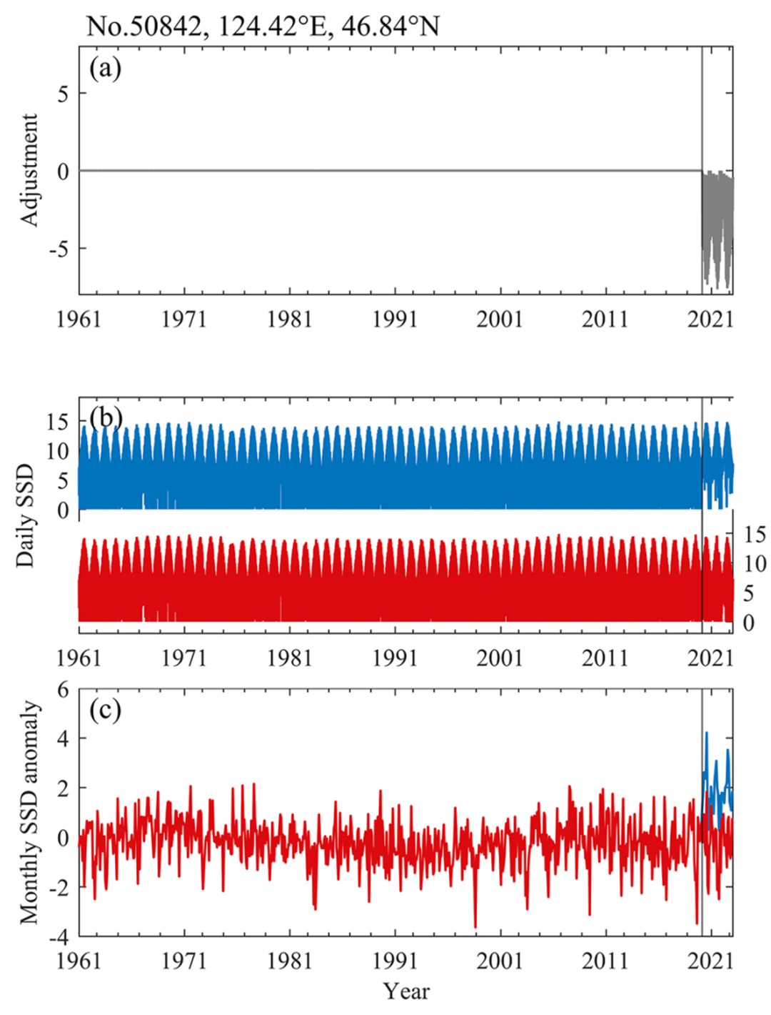 图1. 站点#50842的原始SSD(蓝线;单位:h d-1)与经day0型不连续性订正后的SSD(红线;单位:h d-1)对比。垂直灰线表示day0型不连续性的时间。