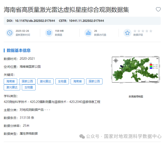 由海南空天信息研究院、海南省地球观测重点实验室的陈博伟老师提交的“海南省高质量激光雷达虚拟星座综合观测数据集”,经审核整理后正式在国家对地观测科学数据中心发布,热忱欢迎广大科研工作者关注并获取数据。