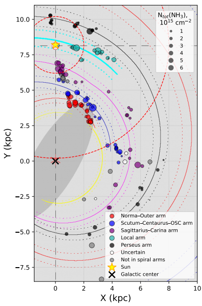 图1. 样本中探测到氨分子的致密团块在银河系的分布。旋臂的位置取自Reid et al. (2019). 数据点的大小显示氨分子柱密度,颜色显示所属旋臂。