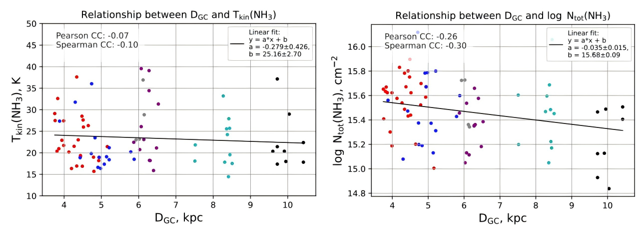 该研究还发现氨分子柱密度与银心距(在2–8千秒差距范围内)之间存在弱的负相关关系,这可能与银河系的化学梯度或密度梯度有关。然而,诸如湍流和旋臂结构等局部条件似乎主导了这些大尺度趋势。
