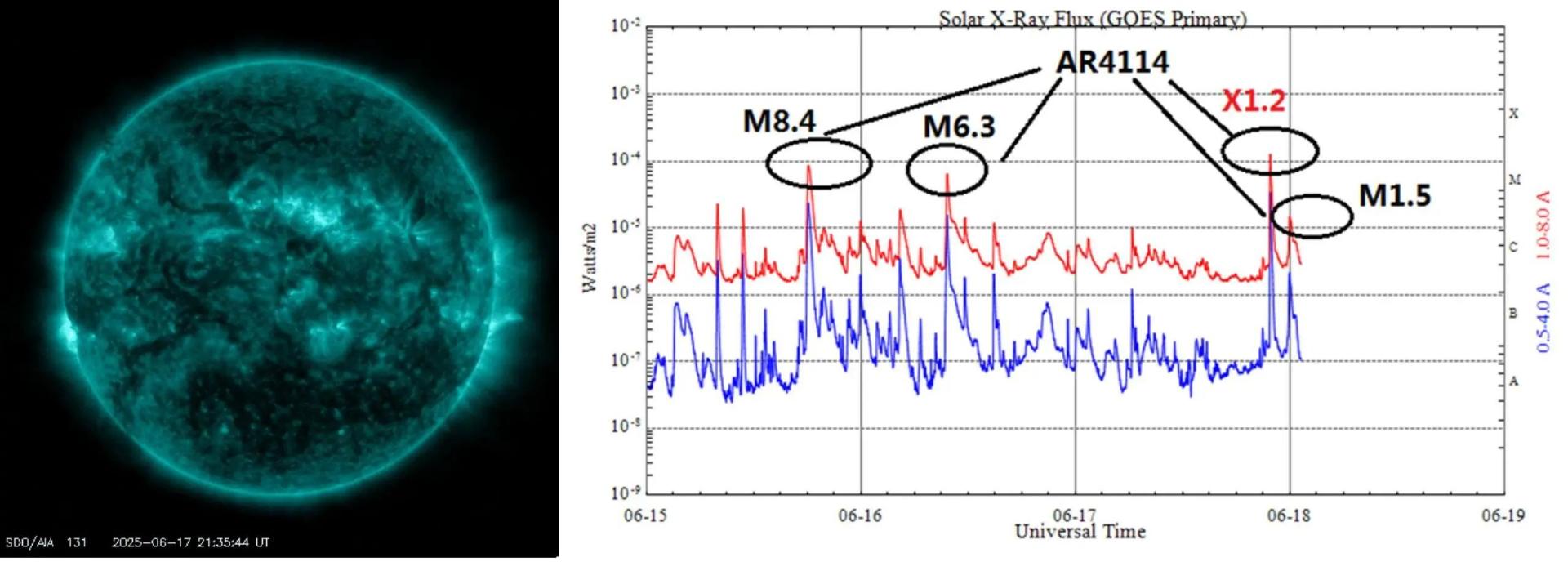 北京时间2025年6月18日05:42,活动区AR4114爆发了一个X1.2级耀斑,于05:54结束,达到橙色警报级别。在此之前,AR4114分别于15日和16日分别爆发了M8.4和M6.3级别的耀斑(见图1)。
