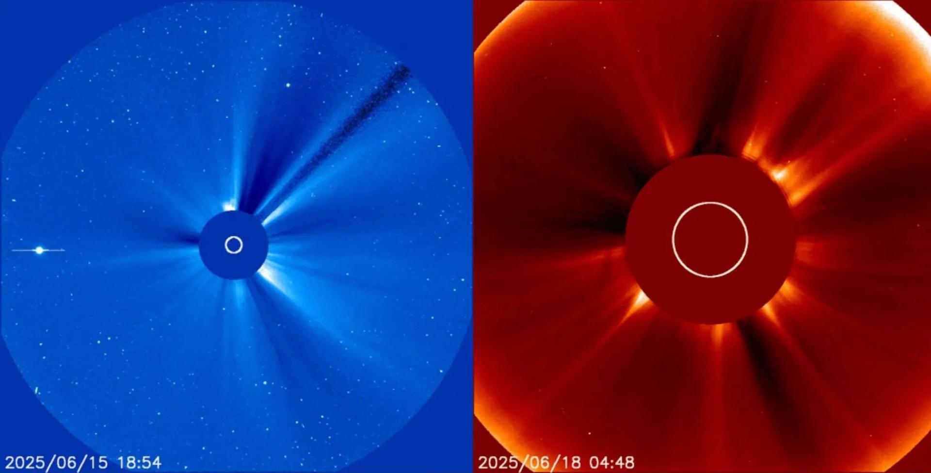 右图:2025年6月18日SOHO卫星(C2)监测的偏晕CME(世界时)
