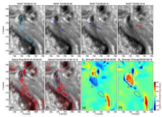 图 2:NVST的光球高分辨率观测展示了白光耀斑足部出现的涡流运动。幅(e)和(f)是通过光流法得到的耀斑前和耀斑中光球速度场。幅(g)和(h)对比了磁场变化情况。