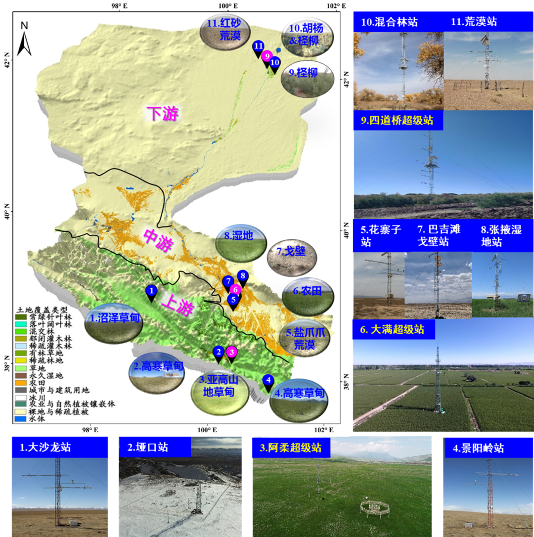 黑河流域地表过程综合观测网始建于2007年,完成于国家自然科学基金委重大研究计划“黑河流域生态-水文过程集成研究”执行期间的2012年。目前有11个站点(3个超级站和8个普通站)以及1个生活基地(黑河遥感站),涵盖了流域主要地表类型。