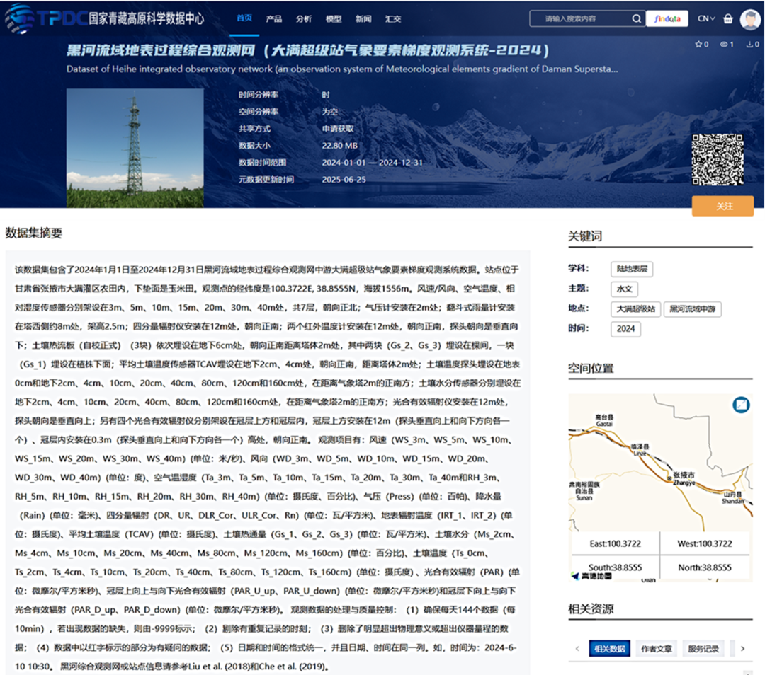2025年7月,2024年黑河流域地表过程综合观测网的数据集(合计32个)在国家青藏高原科学数据中心发布。此次发布的数据集主要包括2024年度黑河流域上、中、下游11个观测站的地表水热碳通量(涡动相关仪、闪烁仪)、水文气象要素(气象要素梯度观测系统、自动气象站、宇宙射线仪)和植被参数(物候相机、叶面积指数传感器网络)等,主要变量包括:感热通量、潜热通量和二氧化碳通量等地表通量;风温湿压、降水量、四分量辐射、光合有效辐射、地表辐射温度、土壤温湿度廓线、土壤热通量和区域土壤水分等水文气象要素;植被物候、植被指数和叶面积指数等植被参数。数据均经过统一的数据处理与严格的质量控制,并通过评审专家的同行评议。用户可通过国家青藏高原科学数据中心网站申请使用。