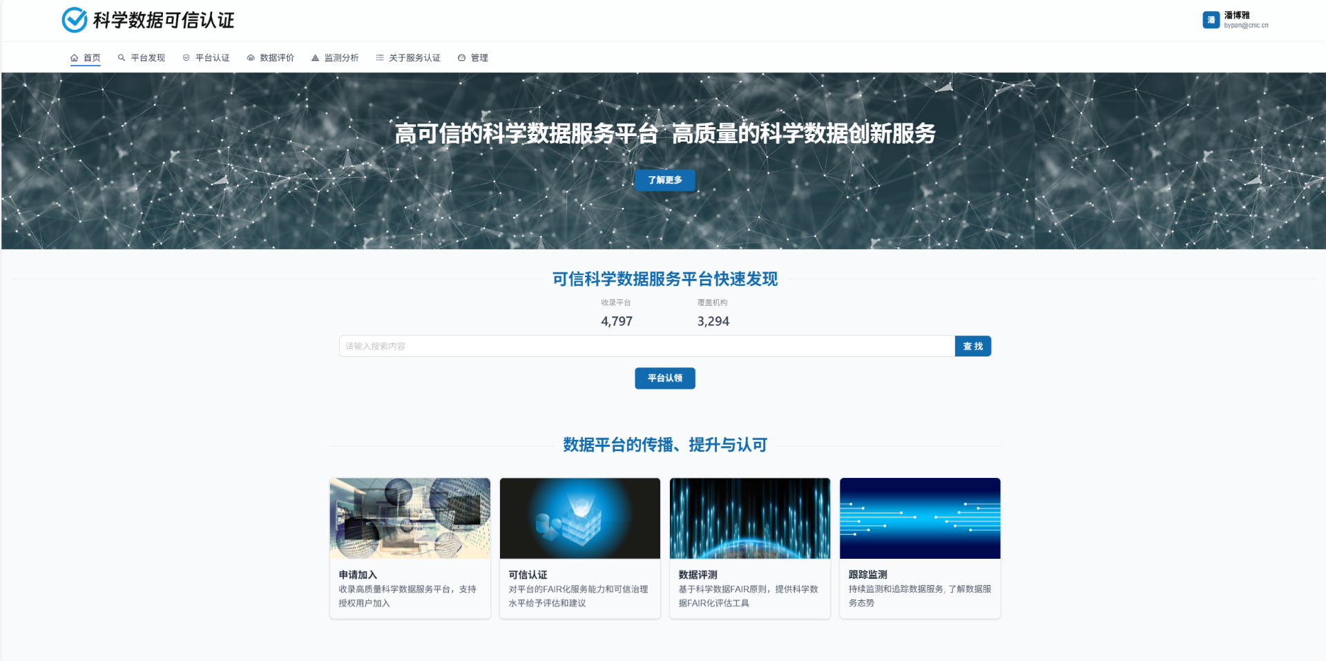 科学数据可信认证平台由中国科学院计算机网络信息中心建设,经国家认证认可监督管理委员会批准(批准号:CNCA-R-2024-1360),主要开展科学数据服务平台可信性评测和认证服务。同时平台还提供科学数据FAIR测评服务,针对科学数据集的规范化管理水平,提供评测和改进建议,为科研人员和机构提供了高效的科学数据评测手段。