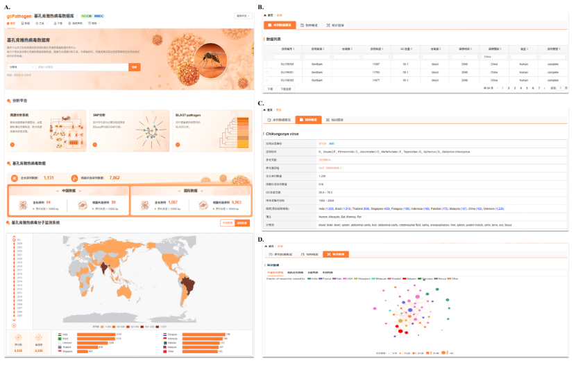图1. CHIKVdb可视化页面展示。A.首页。B.序列数据概览页。C.物种概览页。 D. 知识图谱页面。