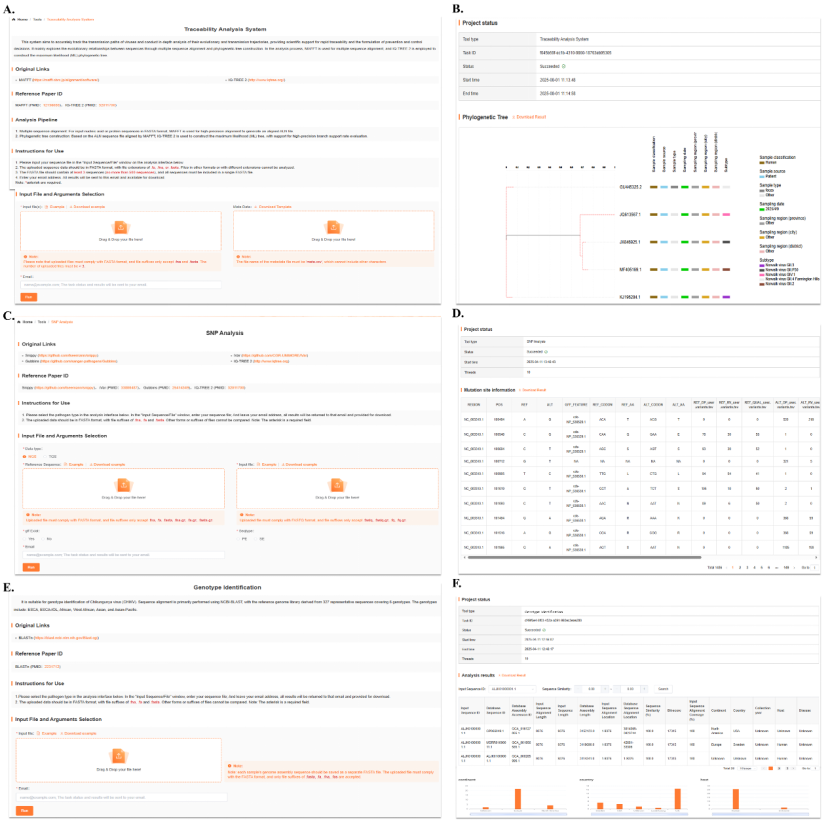 图2. CHIKVdb 一站式分析平台界面。A.溯源分析系统操作页面。B.溯源分析系统结果展示页面。C. SNP分析操作页面。D. SNP分析结果界面。E. 基因型鉴定工具页面。F. 基因型鉴定结果展示页面。
