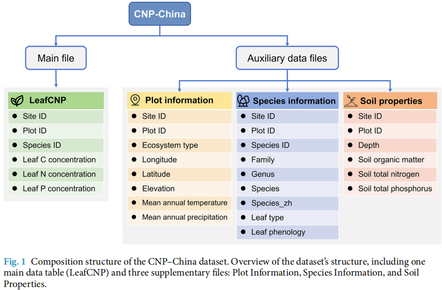 近日,国家生态科学数据中心发布了2005-2020年中国森林叶片碳氮磷浓度数据集(Leaf Carbon-Nitrogen-Phosphorus Concentrations in China's Forests, CNPChina),用户可通过生态网络云平台(https://www.nesdc.org.cn)在线访问获取数据。该数据集不仅为研究森林养分化学计量的时空格局提供坚实基础,也有助于深入理解植物的养分适应策略及其在全球环境变化背景下的响应机制。相关研究成果以“Leaf carbon nitrogen and phosphorus concentrations in dominant trees across China’s forests from 2005 to 2020”为题发表在Scientific Data期刊。