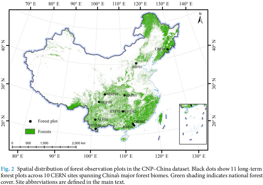 森林生态系统是陆地碳储量的重要组成部分,在调节全球碳循环和减缓气候变化等方面发挥着关键作用。碳 (C)、氮 (N) 和磷 (P) 是植物生长和代谢的基本元素,叶片中C-N-P的紧密耦合关系不仅反映了植物对环境变化的适应策略,也直接影响其光合作用效率,其化学计量对于理解全球变化背景下植物的养分利用效率以及生态系统尺度上C-养分相互作用具有重要意义。然而,目前关于中国不同森林生态系统植物叶片C、N、P浓度的系统化、长期观测数据仍然稀缺。