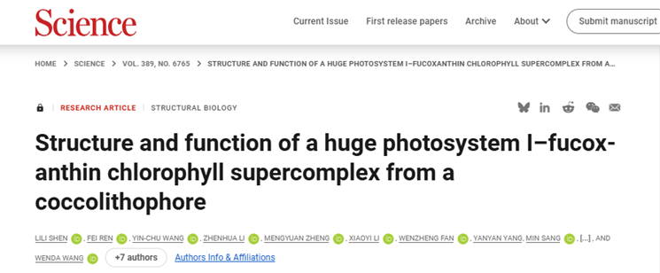 9月12日,国家基础学科公共科学数据中心(简称“国家基础数据中心” )“中国海岸带植物资源数据库”在多学科融合创新方面取得重要成果。相关研究成果已通过论文“Structure and function of a huge photosystem I-fucoxanthin chlorophyll supercomplex from a coccolithophore”发表于国际著名顶级期刊《Science》,并作为封面报道。论文由国家基础数据中心“中国海岸带植物资源数据库”负责人、中国科学院烟台海岸带研究所王寅初博士与中国科学院植物研究所王文达研究团队等共同完成,王寅初博士是论文共同第一作者。