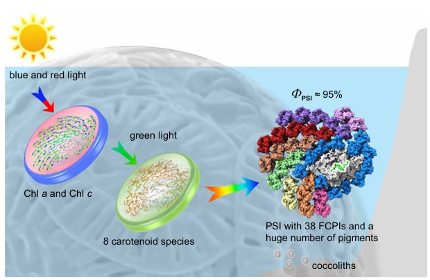 论文揭示了赫胥黎艾氏藻光适应进化的重要机制(图1),报道了来自赫胥黎艾氏藻的光系统I-岩藻黄素叶绿素a/c结合蛋白(PSI-FCPI)超级复合物三维结构与色素蛋白特征,分辨率为2.79 Å。该结构显示了一个由51个蛋白亚基和819个色素分子组成的、分子量高达1.66兆道尔顿的巨大超复合物。飞秒瞬态吸收光谱结果表明赫胥黎艾氏藻PSI-FCPI在不同光波段下的光能量子转化效率超过95%。该研究首次在原子层面揭示了颗石藻通过扩展和优化其光系统结构来适应海洋光环境的独特策略,是光合生物光适应进化研究中的一个重大发现(图2)。