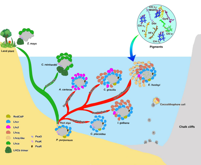 光系统I-捕光天线复合体在光合作用中负责将光能转化为化学能。由于光合生物对不同光环境的适应性,该复合体在结构和大小上呈现显著差异。特别是从海岸带向“陆”和“洋”两个方向的环境适应过程中,光系统I-捕光天线复合体更是经历了深刻的演化。颗石藻起源于古海岸带,于中生代征服远洋并达到繁盛,对当今全球的气候和生态意义重大。其中,赫胥黎艾氏藻(Emiliania huxleyi)是颗石藻类群中最著名的模式生物,是海岸带生物学中的重要研究对象。因此,赫胥黎艾氏藻光系统I-捕光天线复合体光能利用分子机制的研究对于海岸带生物适应性进化的研究意义非常重大。