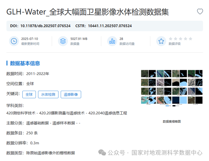 由武汉大学李彦胜老师团队提交的“GLH-Water_全球大幅面卫星影像水体检测数据集”,经审核整理后正式在国家对地观测科学数据中心发布,热忱欢迎广大科研工作者关注并使用该数据集。