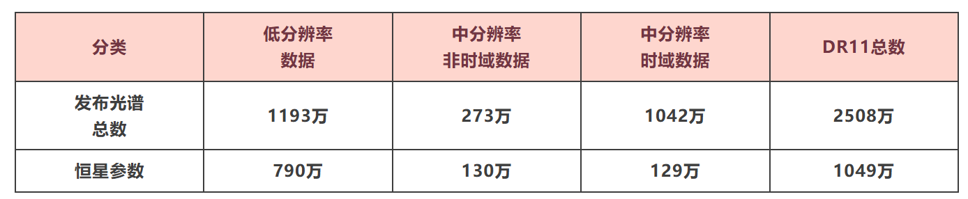 DR11数据集获取于2011年10月-2023年6月,包含了低分辨率光谱数据和中分辨率光谱数据两部分。DR11数据集(v2.0版本)共发布2508万条光谱,包括1193万条低分辨率光谱,1315万条中分辨率光谱,中低分辨率光谱均突破千万。此外,还发布了1049万组的恒星光谱参数星表。LAMOST继续保持发布光谱数和恒星参数星表总数国际第一的地位。