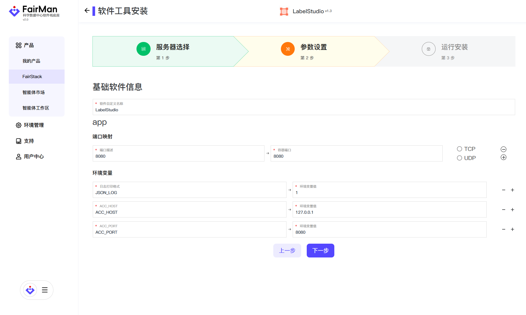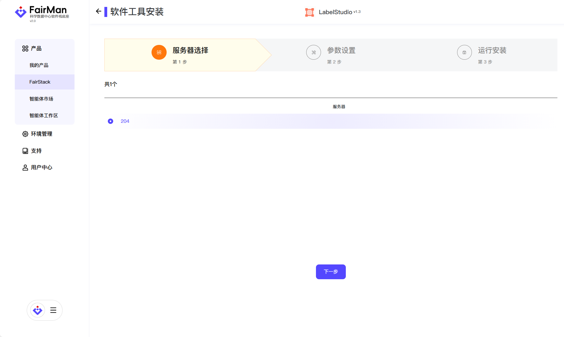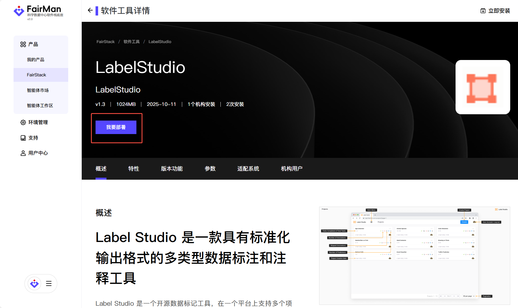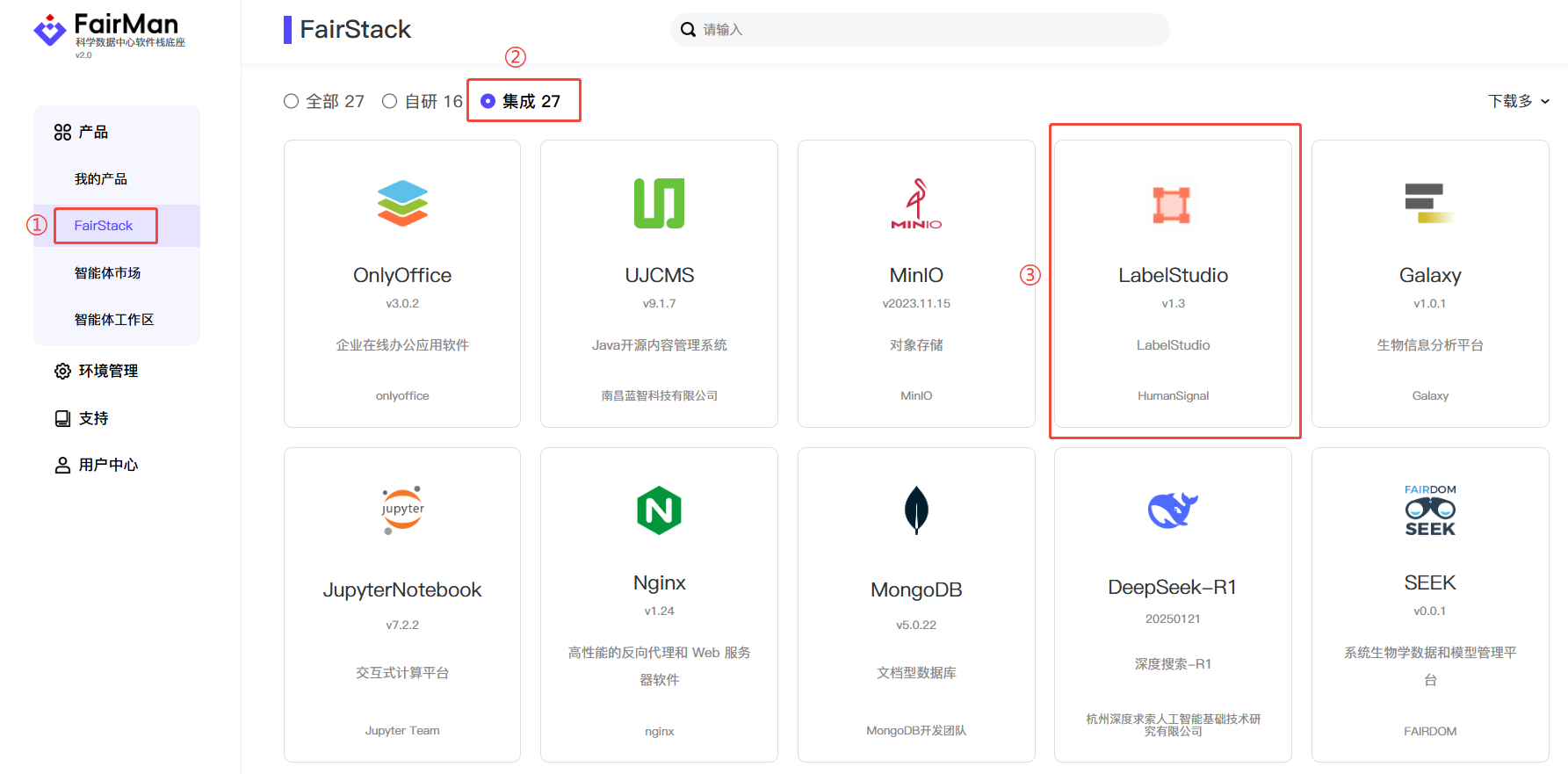 1.在科学数据软件栈安装底座FairMan中,进入【产品】—【FairStack】,点击【Label Studio】。