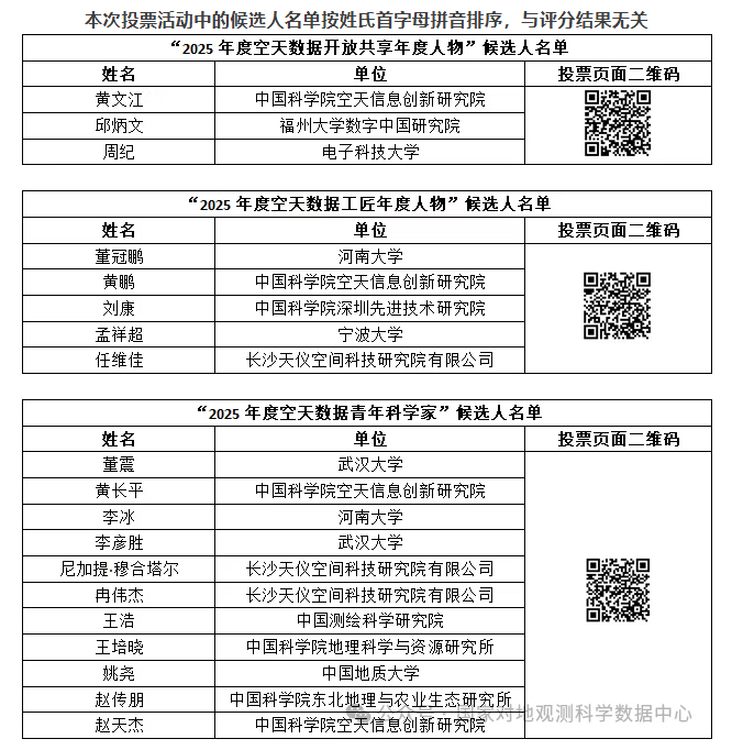 为了促进数据要素支撑社会经济创新发展等国家大数据战略的实施,表彰空天数据科学研究和工程技术人员严谨治学的科学精神和无私奉献的崇高品质,宣传在空天数据科学研究和工程应用领域做出创新性学术成果和重大工程应用成就的国内科学和工程技术人员,激发空天领域科技人员从事科学数据工作荣誉感。国家对地观测科学数据中心等机构举办2025年度“空天数据开放共享年度人物”“空天数据工匠年度人物”“空天数据青年科学家”征集活动。