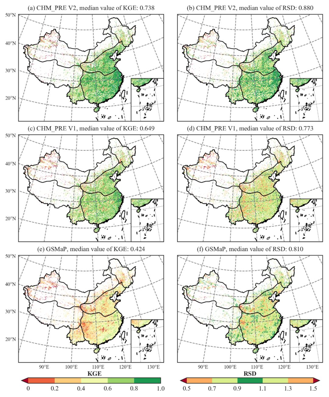 为了全面评估新数据集的精度,研究团队利用自动雨量站的观测数据,将CHM_PRE V2与其他五种主流格点降水数据集进行系统对比。结果显示,CHM_PRE V2在降水量估算精度上显著占优(图2)。其总体平均绝对误差(MAE)和Kling-Gupta Efficiency(KGE)分别达到1.48 mm/day和0.79,较之前的最优数据集精度分别提升12.84%和12.86%。各验证站点KGE和相对标准偏差(Relative Standard Deviation,RSD)中位数分别达到0.738和0.880,较之前的最优数据集精度分别提升13.71%和8.64%。