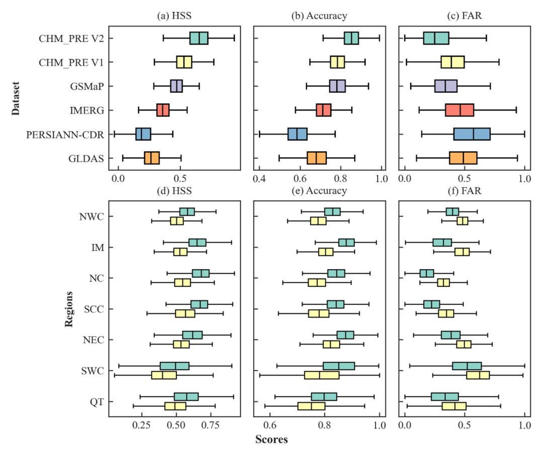 图3 CHM_PRE V2与其他主流降水数据集的降水事件探测能力对比