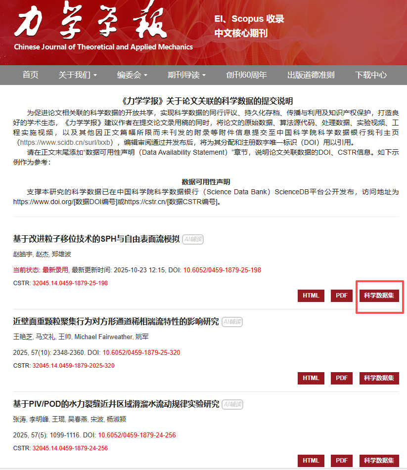 《力学学报》自2022年率先依托中国科学院科学数据银行(ScienceDB)开展论文关联数据出版以来,已累计出版34个数据集、919个数据文件,累计访问量达27万次。2025年,《力学学报》获得中国科学院数据论文专栏项目支持。