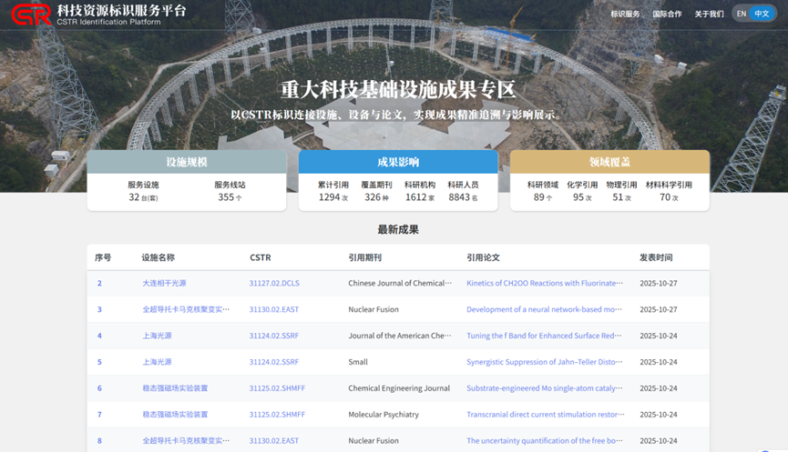 专区基于我国自主科技资源标识CSTR,实现大科学装置及其线站产出科技成果的精准追溯,显著提升重大科技基础设施成果的可发现、可引用,助力大科学装置影响力透明化与资源价值最大化。截至目前,专区已累计服务重大科技基础设施32台(套),线站355个,覆盖326种学术期刊,涉及化学、物理、材料科学等89个细分领域,链接1612家科研机构与8843名科研人员,为我国重大科技基础设施提供数据基础与服务支撑。