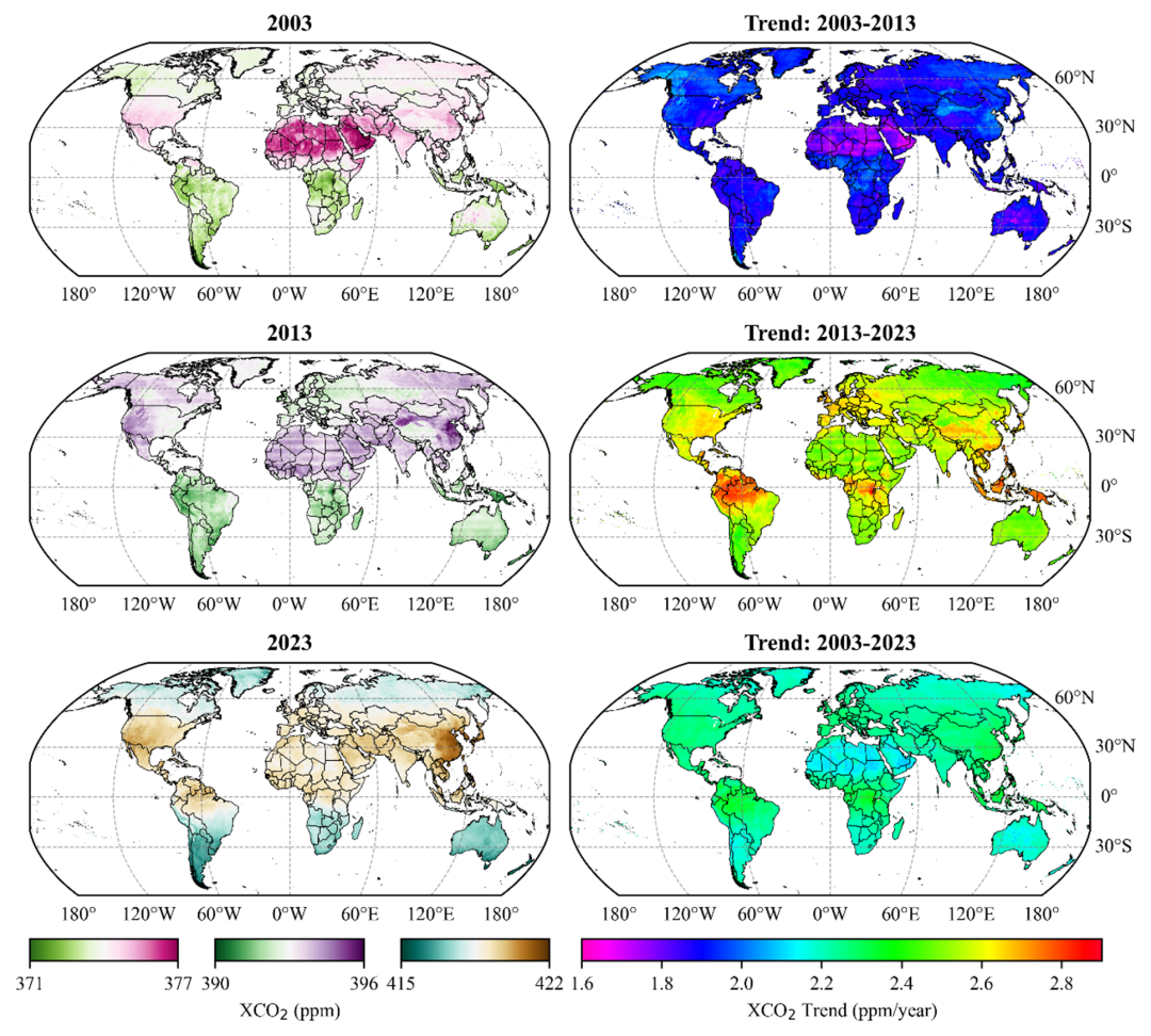 图1 2003/2013/2023 年全球陆地 XCO₂年均分布与 2003–2023 年增速(ppm/yr)