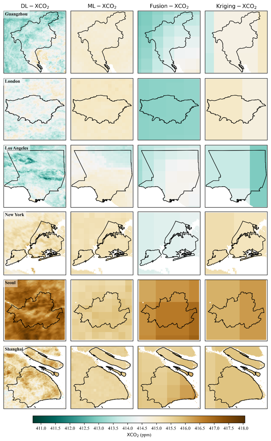 图2 典型超大城市 1 km XCO₂与其他公开粗分辨率产品对比