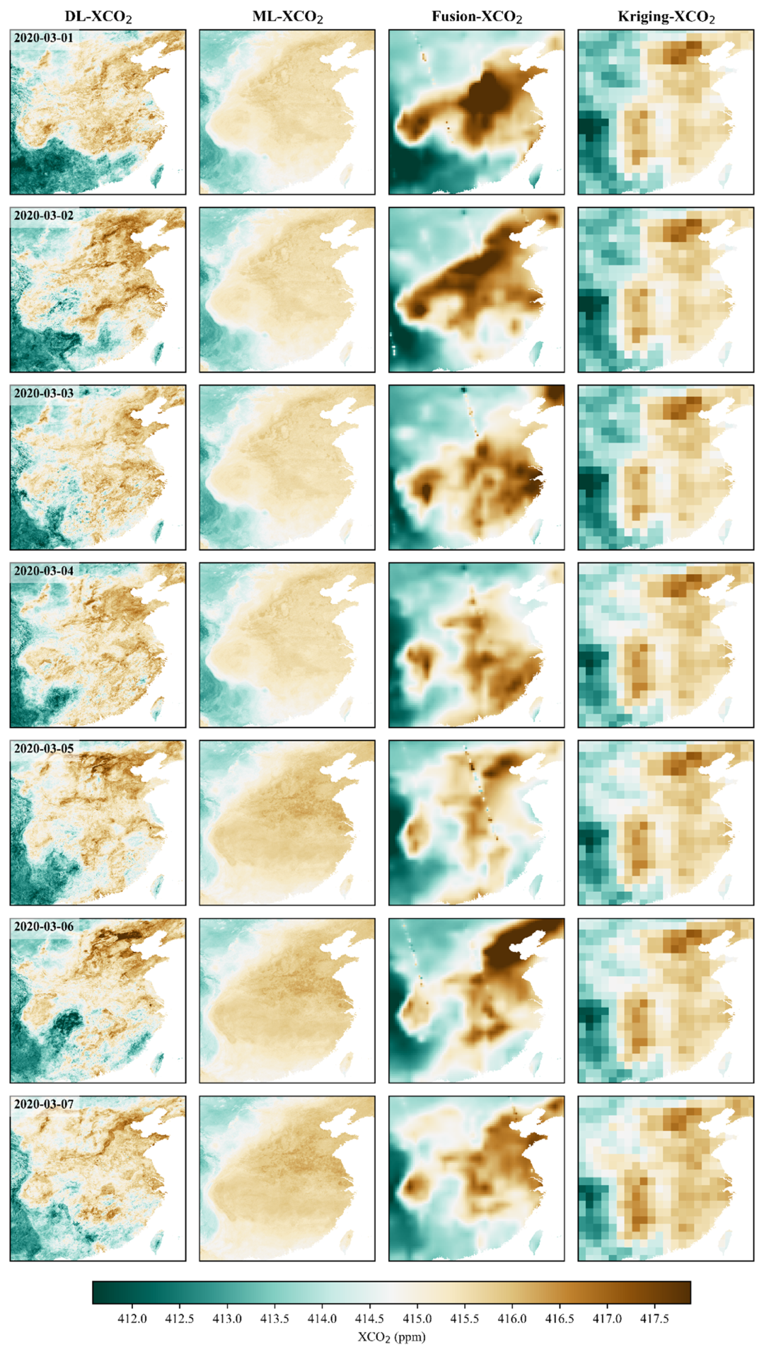 2003–2023 年全球陆地 XCO₂呈持续上升态势,图1呈现了 XCO₂的长期格局与热点分布。凭借 1 km 的高空间分辨率,本数据集在城市尺度揭示出清晰的“城市—郊区”梯度与高值羽流,并显著优于1°/0.25°/0.05° 等公开粗分辨率产品;图 2 以北京、上海、东京、纽约等超大城市为例展示了这种细节解析能力。此外,数据在时间维度上同样具备高保真度,图3以华东地区 2020-03-01 至 03-07 的日际演变为例,捕捉到 XCO₂羽流范围与强度的快速变化。基于上述特性,数据可直接支撑城市与区域碳排放评估(刻画空间梯度、峰谷演变与治理成效)、碳源汇反演与政策评估(服务“双碳”量化监测与考核)以及气候—生态耦合研究(与植被、火点、边界层高度、风场等要素联动解析机理);同时,配套提供的月 / 年平均产品便于开展多时间尺度的趋势与评估分析。