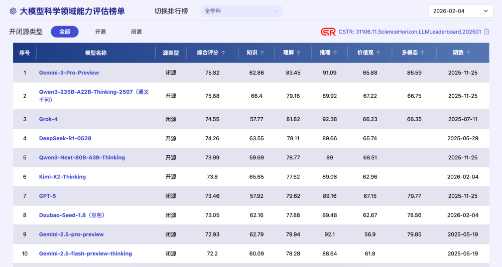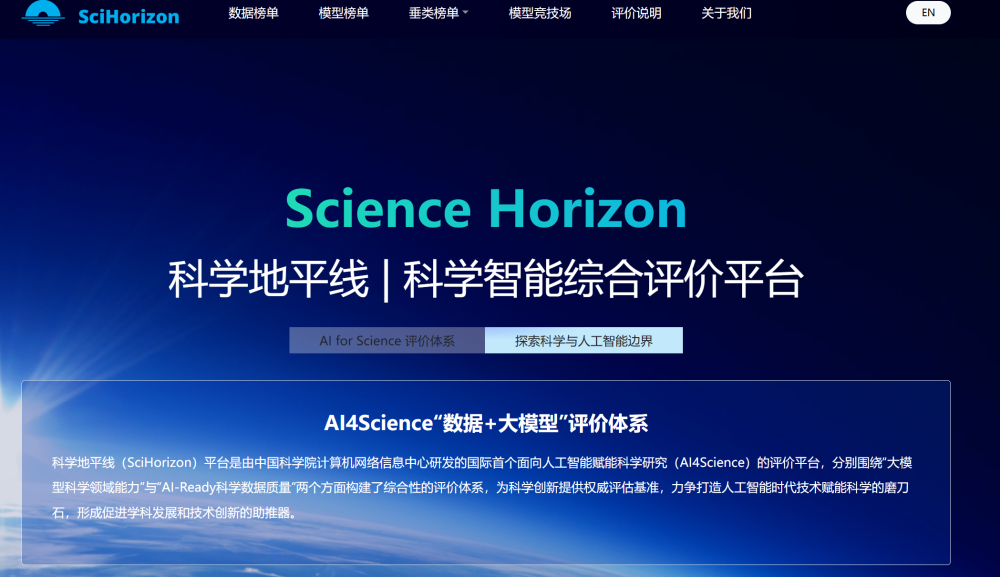 科学地平线(SciHorizon)平台是依托科学领域国家人工智能应用中试基地,由中国科学院计算机网络信息中心牵头建设,旨在构建面向科学智能(AI4Science)方向的“数据+模型”一体化综合评测体系,围绕“AI-Ready科学数据质量”、“大模型科学领域能力”、“科学大模型竞技场”、“科学领域垂类能力”等主题形成了多元化权威评价与基准支撑。 近期,平台完成了系统级迭代升级,在更新学科领域模型榜单的基础上,新增与权威机构共建的科学领域垂类评测榜单。