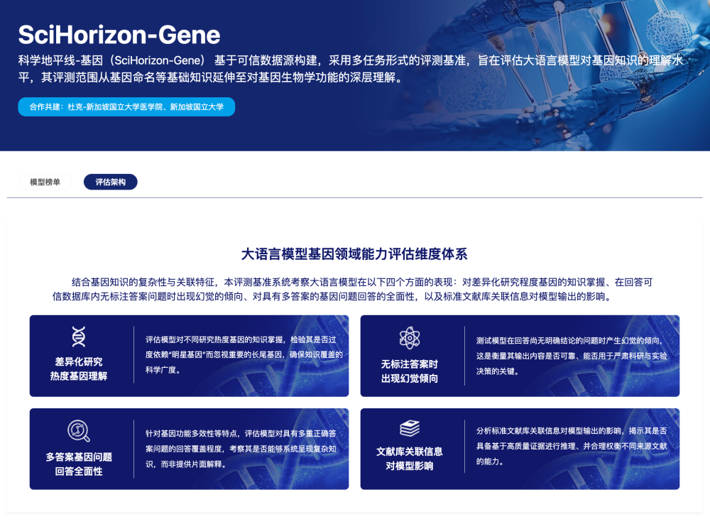科学地平线-基因(SciHorizon-Gene)基于可信数据源构建面向大语言模型的基因知识理解测评基准,旨在评估大语言模型对基因知识的理解水平。结合基因知识的复杂性与关联特征,本评测基准系统重点从四个方面进行考察 :对差异化研究程度基因的知识掌握、在回答可信数据库内无标注答案问题时出现幻觉的倾向、对具有多答案的基因问题回答的全面性,以及标准文献库关联信息对模型输出的影响。